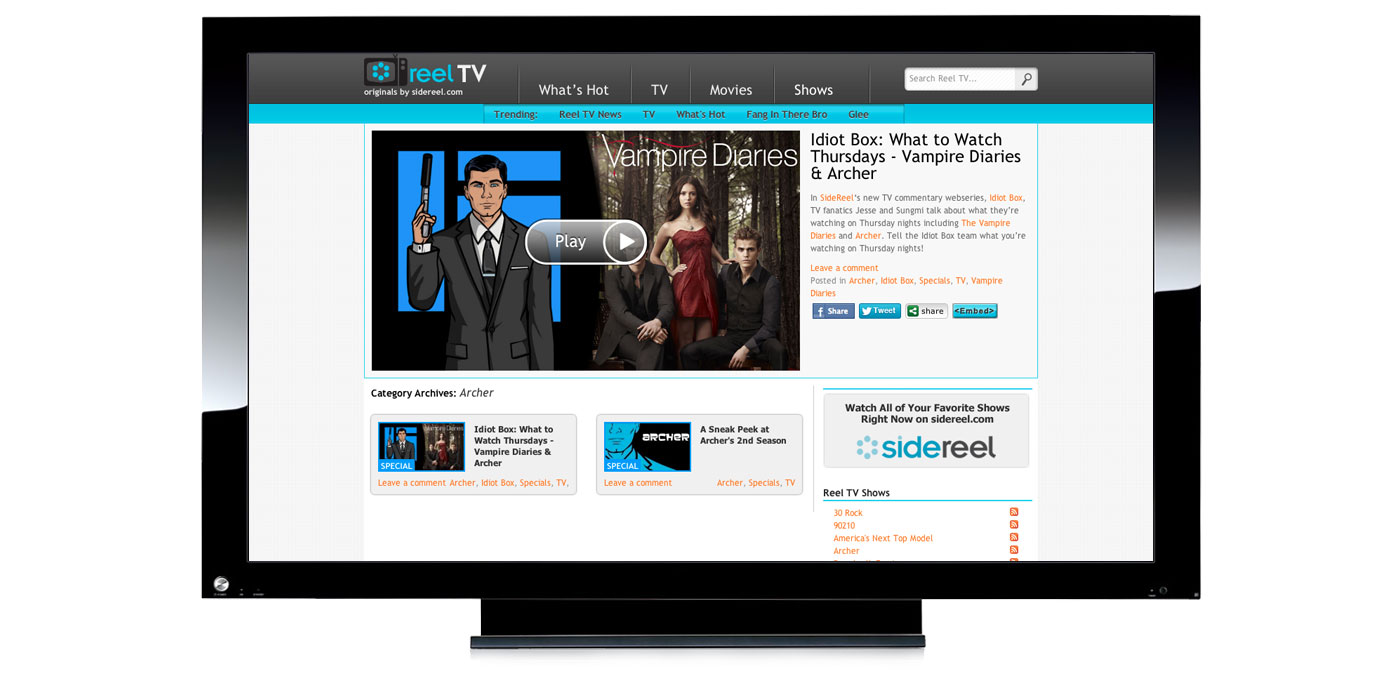 While employed with sidereel.com, I developed Reel TV as a way for them to showcase their in house tv show news commentary, reviews and original spoof series.